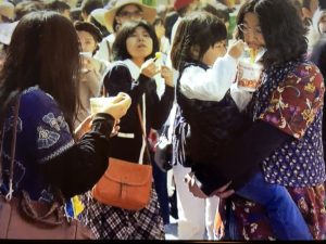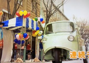 歩行者天国では、ミゼットが登場し、70年代ファッションの若者たちが”まんぷくヌードル”を食べながら歩いています。