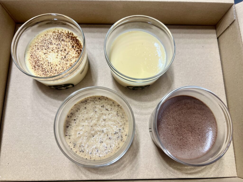 今回、購入してみたのは、カスタードプリン、北海道フレッシュクリームプリン、チョコレートプリン、ロイヤルミルクティープリン。