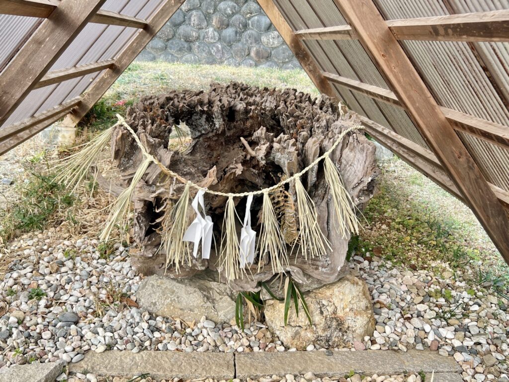 大楠の根本を掘ったところ天井石があらわれ、その下から白銅鏡2面や勾玉などが出土したとのこと。